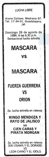 84/08/26 mask Fuerza Guerrera Orion Arena Coliseo Guadalajara - Guadalajara, Jalisco