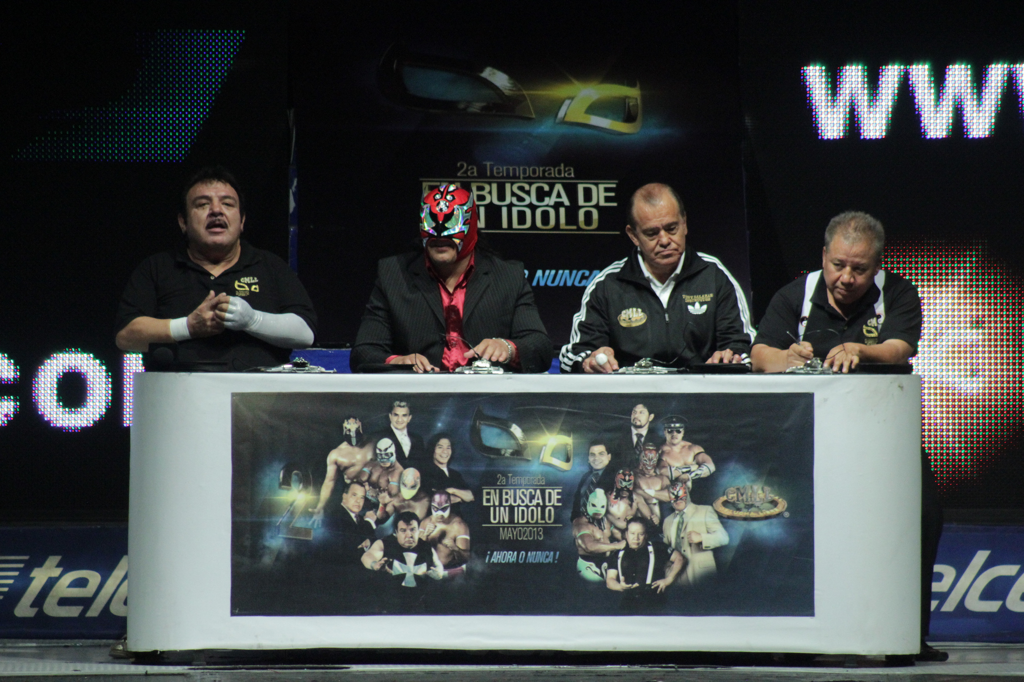 En Busca De Un Idolo 2013's judges table. From left to right: Brazo de Plata, Ultimo Guerrero, Tony Salazar, and El Tirantes.