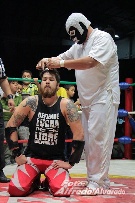 Médico Infernal shaving-off Kaientai after beat him in a Mask vs Hair Match.