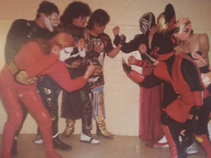 Picture of Takeda, Maravilloso, El Samuray & Enigma agaisnt Los Vatos Locos for the Mex Atomicos Titles. Ciudad Juárez, 1999.